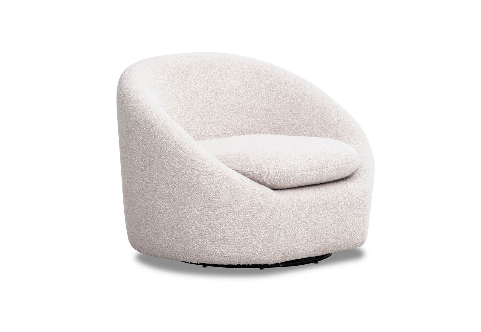 It has a round black swivel base and is upholstered in white boucle fabric.